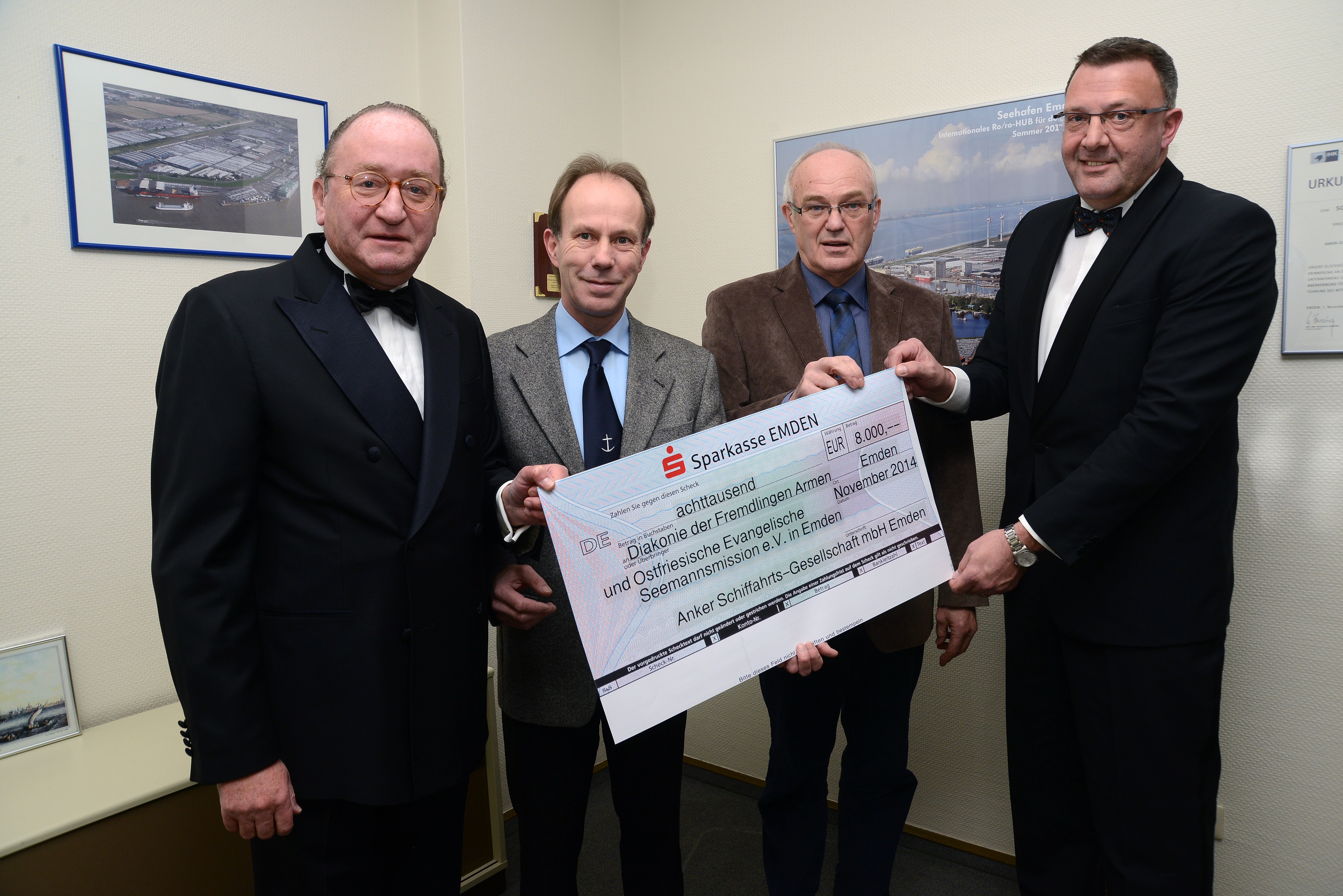 8.000 Euro Spenden sind anlässlich des Firmenjubiläums der Anker Schiffahrts-Gesellschaft für die Diaconie der Fremdlingen Armen und die Ostfriesische Evangelische Seemannsmission e.V. zusammen gekommen. Der Betrag wurde von dem Unternehmen aufgerundet. „Wir freuen uns über die Spendenbereitschaft unserer Geschäftsfreunde und sehen sie als Wertschätzung unseres Unternehmens“, so Jörg Conrad. Für Anker Schiffahrt betonte der Prokurist, Jan Remmers, die enge Verbundenheit des Unternehmens mit der Seehafenstadt. Am 28. November wurde die Spende an die beiden gemeinnützigen Einrichtungen der Stadt Emden übergeben.
